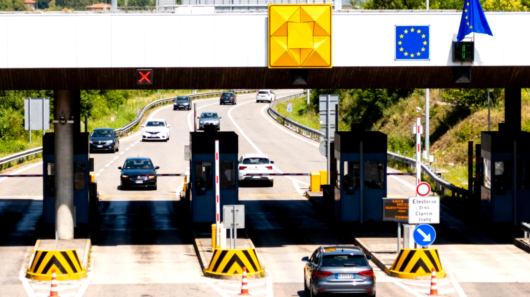 Accanto alla “T” gialla, su molti caselli compare anche una bandiera dell’Unione Europea. Non è un dettaglio decorativo. Quel simbolo segnala che la corsia è abilitata all’interoperabilità europea del telepedaggio, ovvero che i dispositivi certificati secondo gli standard EETS (European Electronic Toll Service) possono essere utilizzati senza problemi.